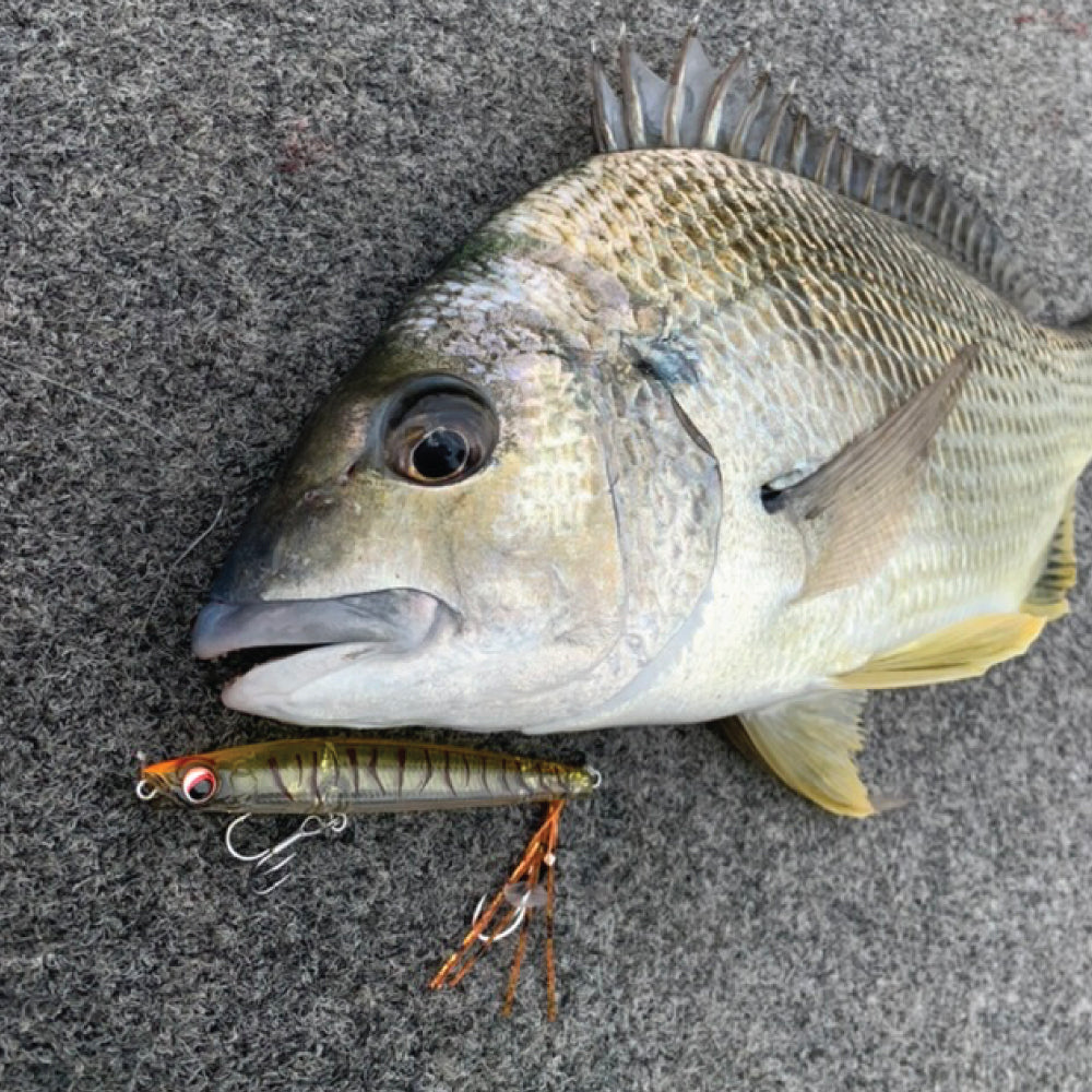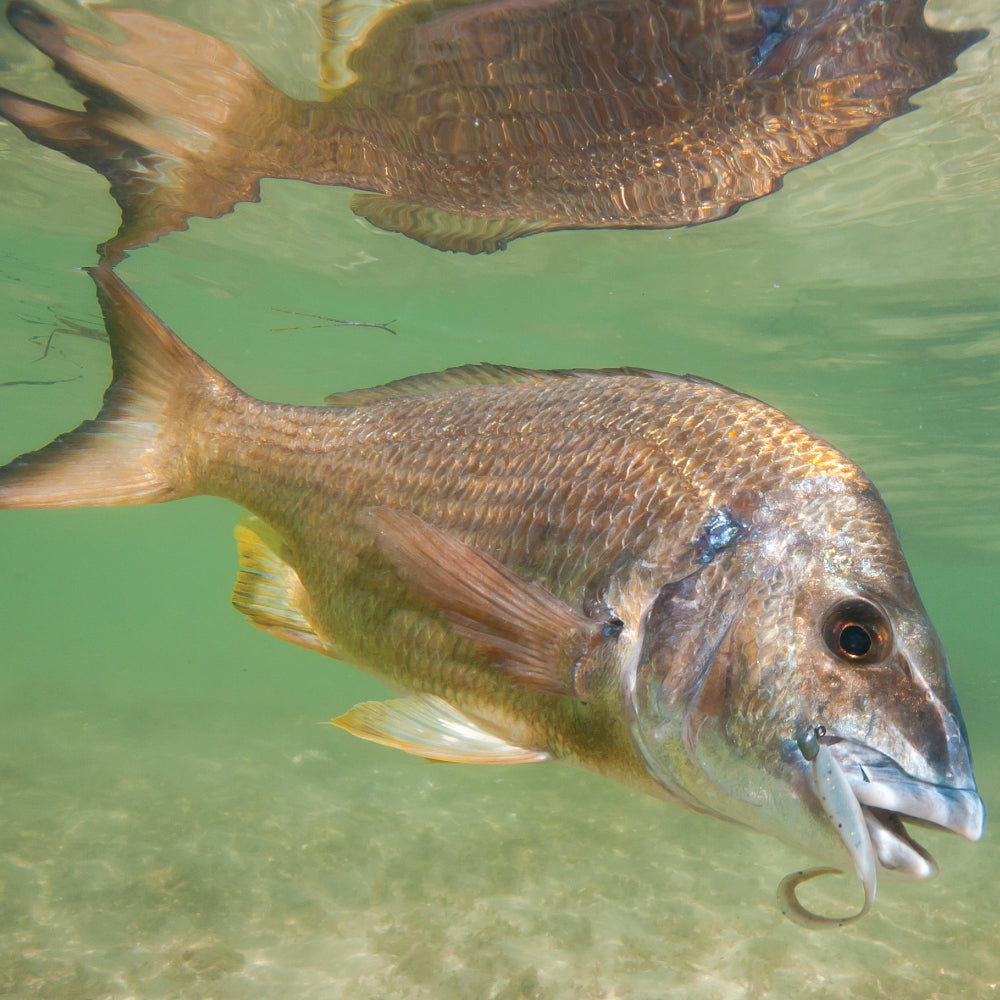 In the warmer months bream love to slurp small surface lures from the shallow weedbeds and sandflats and they aren’t shy to attack a lure in super shallow water! The technique is simple. Cast as far as you can across the shallow water, wind the lure back with a jiggle on your rod tip to ensure a zig zag motion of the lure and give it a quick pause now and then for dramatic effect. Our favourite lures are the Bassday Sugarpens and the Daiwa Slippery Dog surface lures. They work straight out of the box!