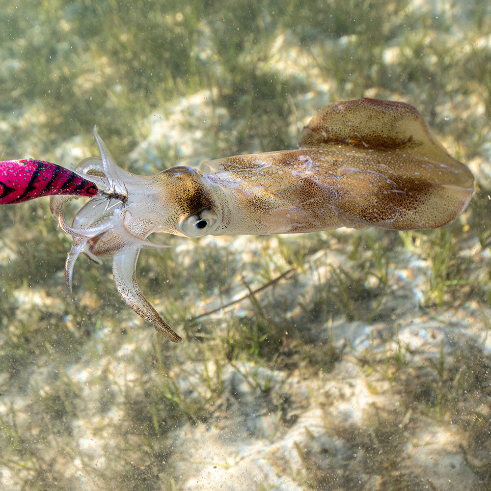 Arrow Squid (Doryteuthis plei) on the other hand, prefer enclosed waters such as harbours and estuaries. Often found within the urban structure of Sydney's infrastructure, these Squid are characterised by their streamlined appearance, and arrow shaped winglets on their hood and only cover the last third of their body, unlike calamari squid, their wings run along their whole body. Arrow Squid are known to have more monotone colours than Calamari, but still have the ability to change from white to red when frightened or feeding. These Squid can reach a maximum hood length of 25cm, but are commonly caught at all sizes, ranging from 5cm, to 20cm hoods.