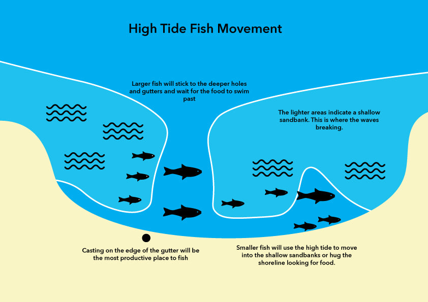 Holes are a little different to a gutter. These deeper parts of the beach don’t drain back out into the ocean.These holes can produce big fish too. Around higher tides jewfish will venture into these holes and cruise around waiting for food. They know these areas can be good spots for small mullet to congregate.